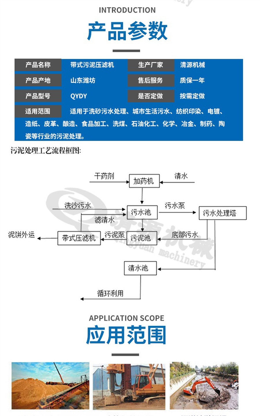 帶式壓濾機(jī)廣泛應(yīng)用于城市生活污水、紡織印染、電鍍、造紙、皮革、釀造、食品加工、洗煤、石油化工、化學(xué)、冶金、制藥、陶瓷等行業(yè)的污泥脫水處理,也適用于工業(yè)生產(chǎn)的固分離或液體浸出工序。