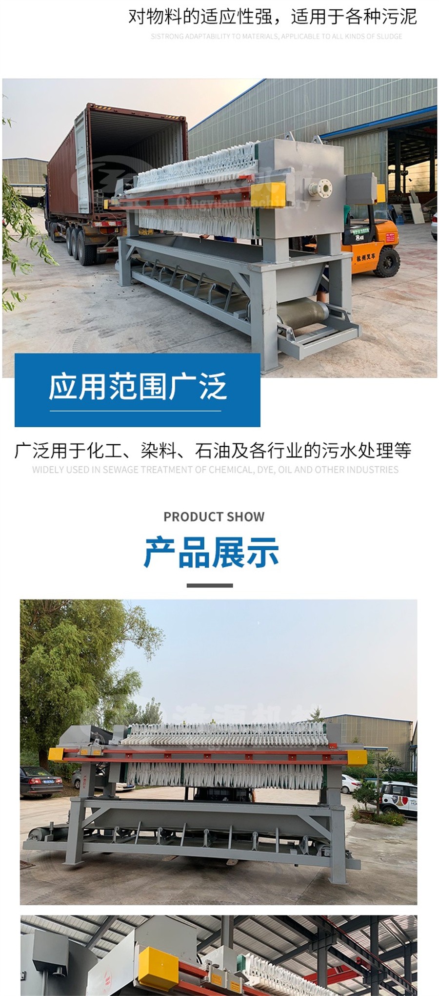 板框式壓濾機對于濾渣壓縮性大或近于不可壓縮的懸浮液都能適用。適合的懸浮液的固體顆粒濃度一般為10%以下,操作壓力一般為0.3~1.6兆帕,特殊的可達3兆帕或更高。過濾面積可以隨所用的板框數(shù)目增減。板框通常為正方形,濾框的內(nèi)邊長為 200~2000毫米,框厚為16~80毫米,過濾面積為1~1200㎡。板與框用手動螺旋、電動螺旋和液壓等方式壓緊。板和框用木材、鑄鐵、鑄鋼