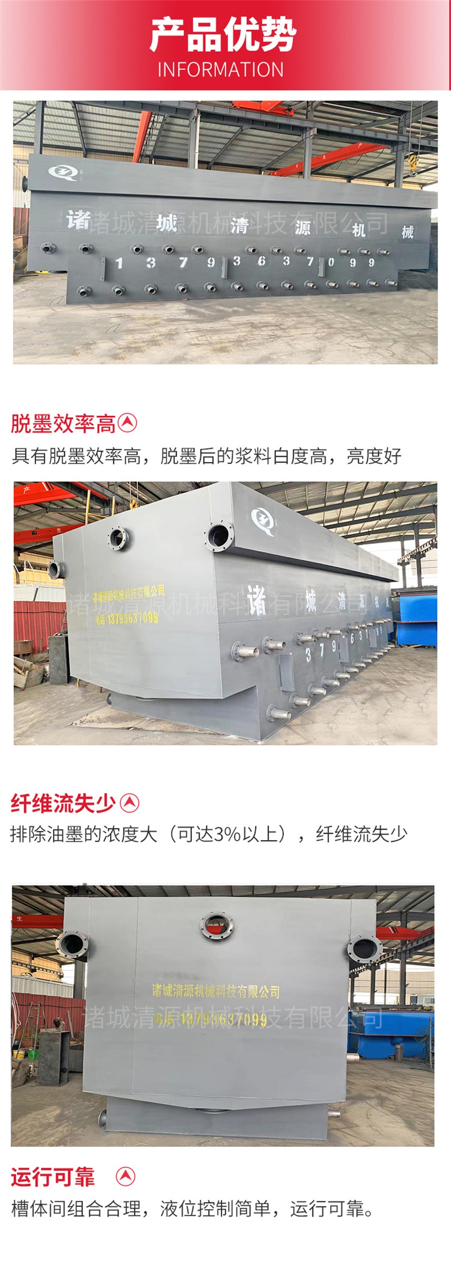 脫墨槽內(nèi)通過特殊結(jié)構(gòu)的級間分離裝置,形成層次分明的多級浮選,防止了不同浮選級間漿料的混合,而空氣的分散及于漿料的混合,是靠特殊開發(fā)的無堵塞射流系統(tǒng)來完成的,這種獨特的裝置結(jié)構(gòu)使紙漿進行內(nèi)部循環(huán),空氣在紙漿內(nèi)被多次利用,大大提高空氣的利用率和油墨脫除效率。脫墨槽具有脫墨效率高,脫墨后的漿料白度高,亮度好,排除油墨的濃度大(可達3%以上),纖維流失極少,占地面積小,操作控制簡單,能耗低等顯著優(yōu)點。
