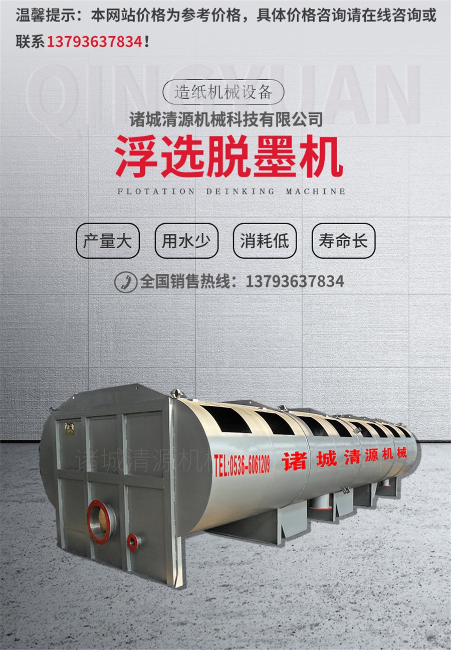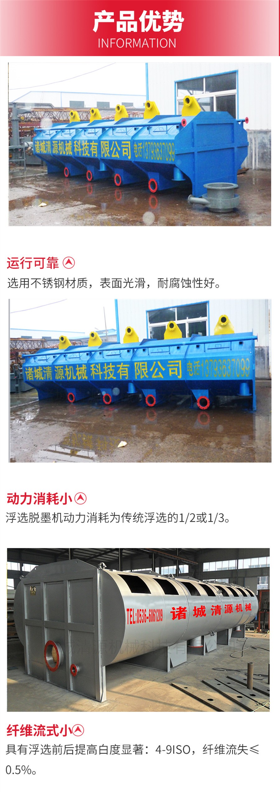 浮選脫墨機具有浮選前后提高白度顯著:4-9ISO,纖維流失≤0.5%,動力消耗為傳統(tǒng)浮選的1/2或1/3。能夠去除油墨顆粒的尺寸范圍大,大約5-550微米。內置式曝氣元件,有利于工藝氣體回路封閉。槽體間組合合理,液位控制簡單,運行可靠,產量范圍大。